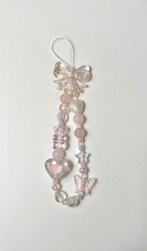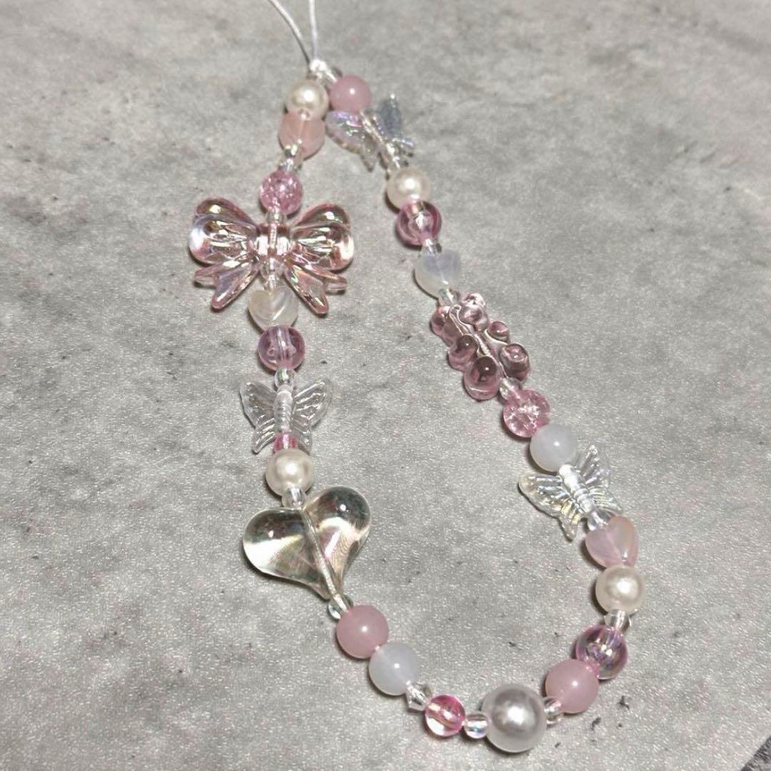 Điểm nhấn trung tâm của dây đeo điện thoại là chiếc nơ trong suốt ánh hồng ở phần đầu, tượng trưng cho sự tinh tế và duyên dáng. Các chi tiết bướm nhỏ và trái tim trong suốt được sắp xếp xen kẽ dọc theo thân dây, tạo hiệu ứng thị giác uyển chuyển, giống như một món trang sức mini dành riêng cho điện thoại. Tone màu hồng, trắng sữa và ánh ngọc trai giúp tổng thể hài hòa, dễ nhìn và phù hợp với nhiều phong cách khác nhau.